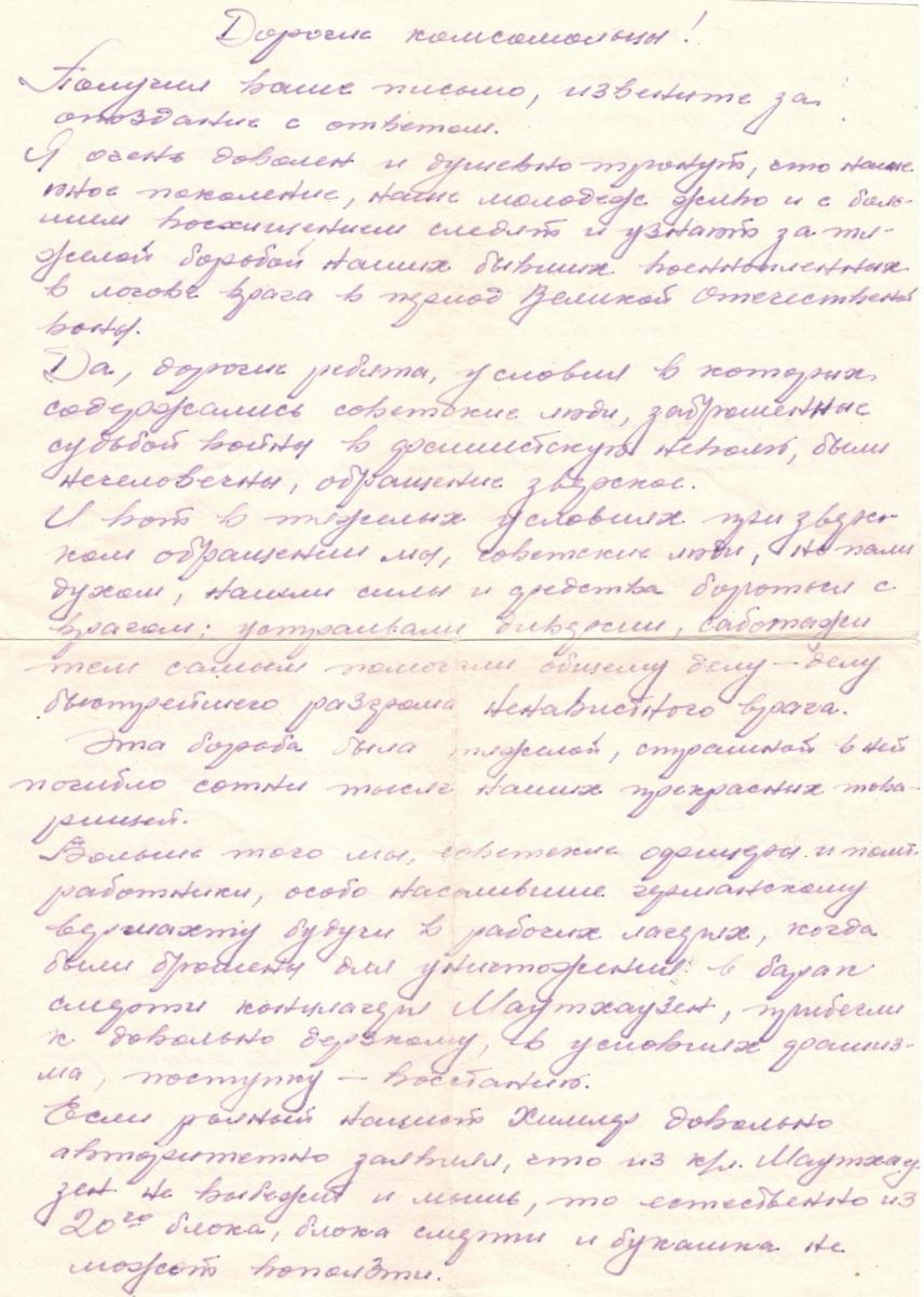 Саатчян Г.Р., Саатчян М.Г. Письмо В.Н. Украинцева, героя восстания 1945 года в концлагере Маутхаузен, комсомольцам школы № 1138 московского наукограда Институт Пути (публикация исторического источника)